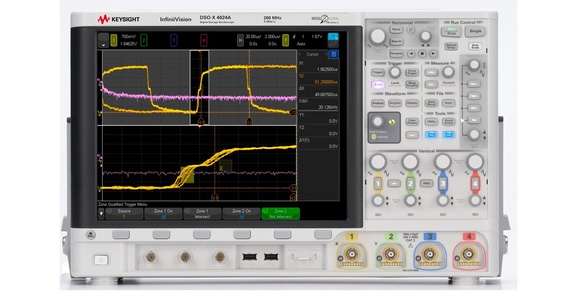 Прибор оснащён четырьмя аналоговыми каналами с полосой 350 МГц и максимальной частотой дискретизации 5 Гвыб/с (½ каналы).